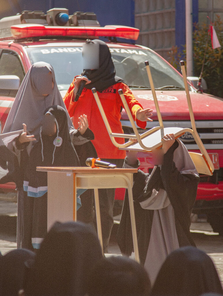 Kegiatan pagi itu dimulai sekitar pukul 08.00 WIB, tim dari BPBD Kota Bandung datang dengan perangkat yang lengkap diiringi dengan mobil merahnya yang khas. Seluruh peserta didik berkumpul di 2 titik kumpul, untuk peserta didik laki-laki berkumpul di lapang gedung 3, sedangkan untuk peserta didik perempuan berkumpul di lapang gedung 1. Sebelum melakukan simulasi mitigasi bencana, Tim BPBD Kota Bandung terlebih dahulu memberikan pematerian kepada seluruh peserta didik yang disambut dengan sangat antusias dan penuh perhatian.